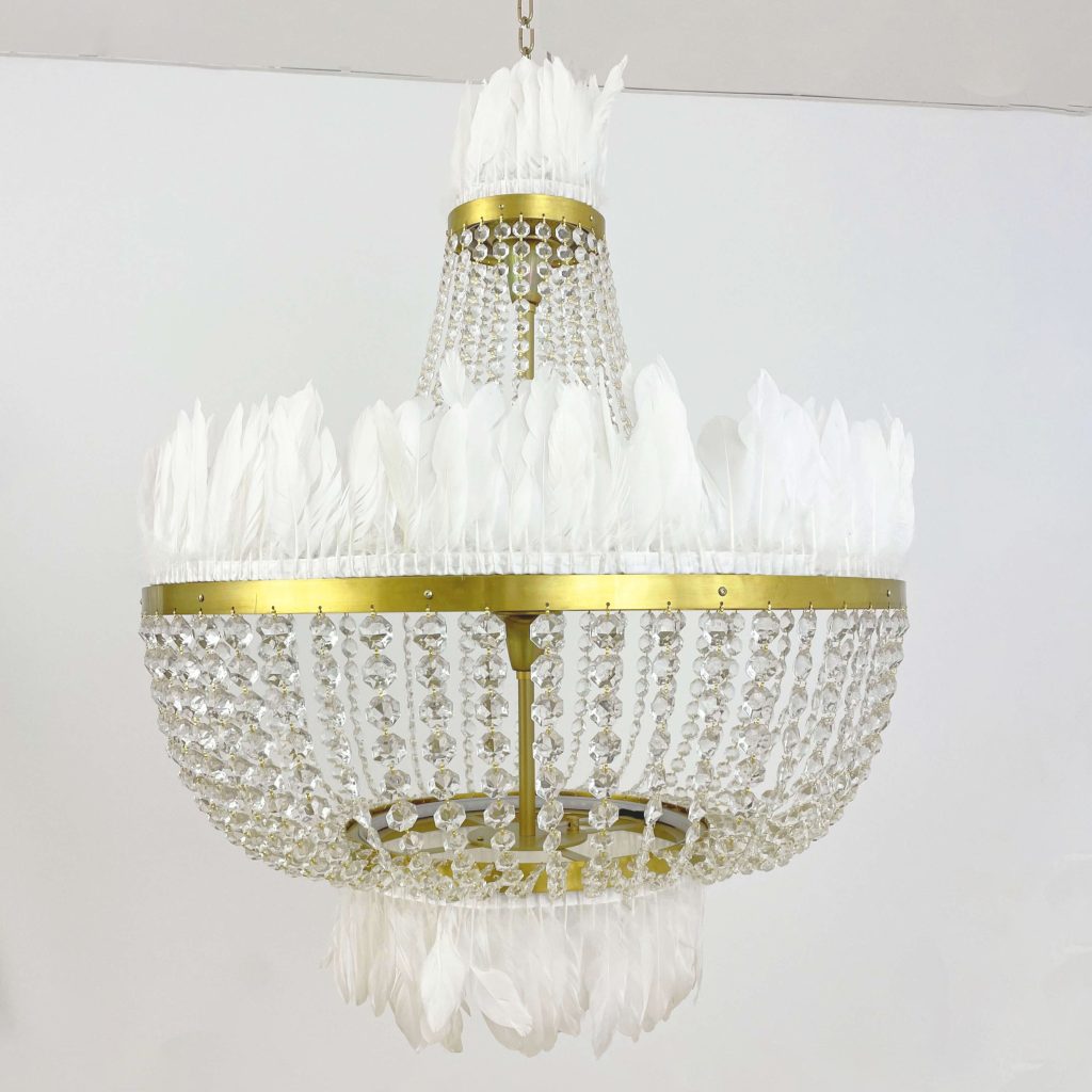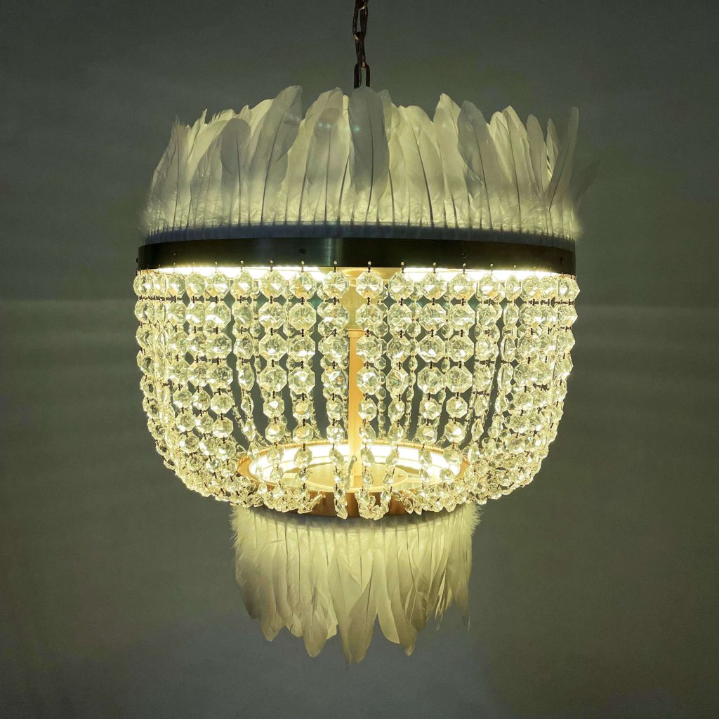 Con lágrimas de cristal que reflejan la luz, detalles en dorado que aportan sofisticación y un toque inesperado de plumas blancas, esta pieza se convierte en el centro de todas las miradas.
