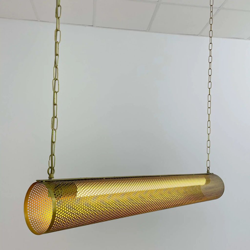 Si buscas algo más limpio pero igual de elegante, las formas cilíndricas en latón son un acierto seguro. La Lámpara de techo colgante vintage Odilia es el ejemplo perfecto: minimalista, dorada y con una presencia sutil pero contundente.
